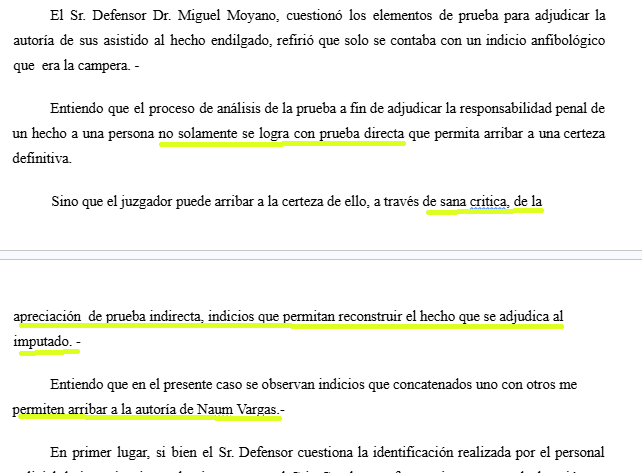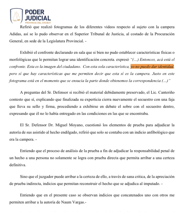 Como bien señaló Miguel Moyano, abogado de Naúm en el juicio, la pericia scopométrica fue insuficiente (no se pudo confirmar que físicamente es Naúm el del video). Entonces, la jueza Ponce validó una “identificación impropia” de la Brigada de Investigaciones, debido a que el personal policial posee un “conocimiento aprendido”. O sea, se apoyó en el olfato policial -que le había permitido allanar la casa de Naúm y encontrar una campera como esa del video. Le bastaron “indicios” y “pruebas indirectas”, según escribió al sentenciar a Naúm.