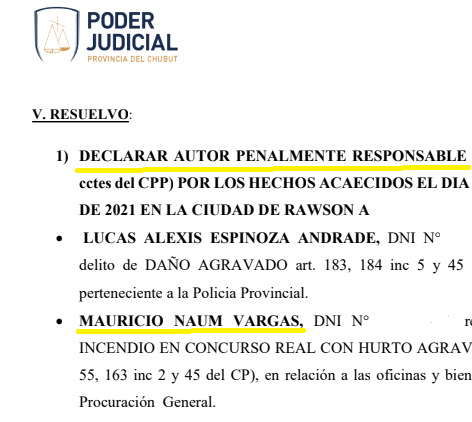 Tras el caos del Chubutazo, la revuelta popular de siete días que consiguió la derogación de la ley minera en diciembre de 2021, la justicia provincial fue selectiva para investigar. Por un lado archivó las decenas de denuncias por violencia institucional durante la represión policial a las masivas protestas, y por el otro, procesó, acusó y condenó a un grupo de jóvenes de Rawson por aquellos incendios y destrozos en edificios públicos. El proceso, que duró tres años y comenzó con 24 investigados, fue un procedimiento irregular y flojo de pruebas, según consta en el expediente completo del juicio al que accedimos. El caso fue impulsado por la fiscal Gómez, rubricado por la jueza Ponce y aplaudido por el gobernador Torres. Uno de los pibes acusados, Lautaro Martínez, se suicidó antes del fallo y luego, en una decisión de último momento, fue absuelto. Los demás, seis jóvenes laburantes, fueron condenados; dos recibieron penas de cumplimiento efectivo.
