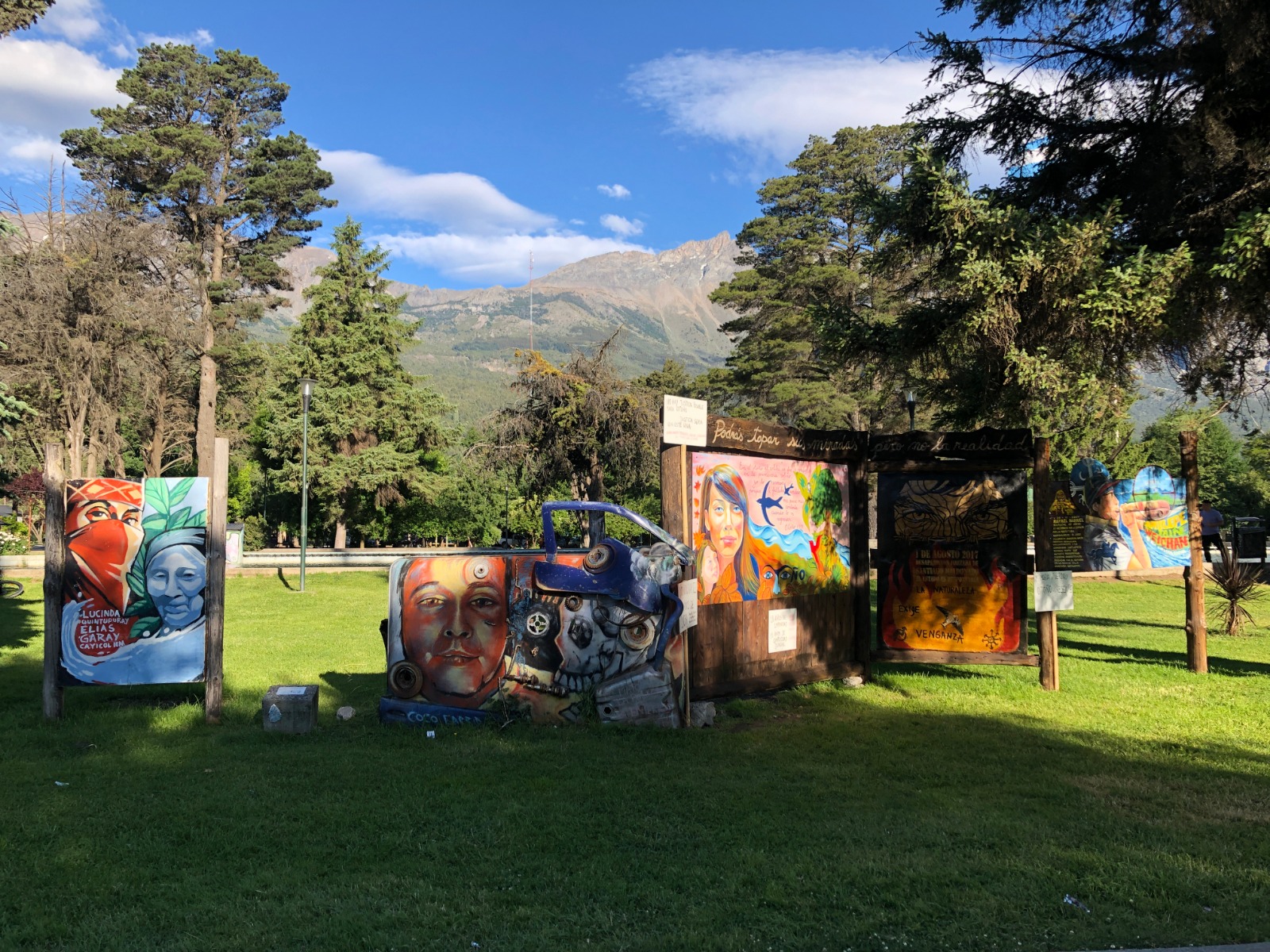Vista de los murales de Plaza Pagano, en El Bolsón.